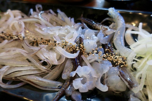 メニューは全部韓国語で読めないけど、イカの刺し身の写真を指さして「イゴジュセヨ(これください)」でオーダー。22000ウォン。約2200円。新宿イカセンターで活きイカ一杯約3000円だから日本よりはいくぶん安いかな。後でメニューの読み方を調べてみたら「산오징어회(サンオンジオフェ)」と書いてあって、サンは「鮮=活き」で、オンジオ=イカでフェは刺身だから、「活きイカ刺身」。