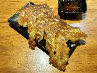 餃子は見た目は焼き過ぎに見えるけど、食べたらそんなに気にならない。下味がしっかりしているので、そのままでも食べられるけど、甘めのタレは悪くない。大きいので、食べ応えがある。