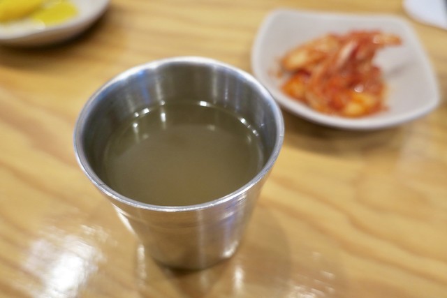 セルフサービスのお水の隣に鰯ダシのサーバーもある。ビビン麺など汁なし麺を食べるときにスープ代わりにダシを飲むらしい。ニボラーなのでダシをおかわりした。一緒に行った人が頼んだミョルチクッスのスープも味見させてもらって、基本的にはセルフサービスのダシと同じスープだと思うけど、麺や具の味や溶け出してるためか丸みのあるマイルドな味わいだった。