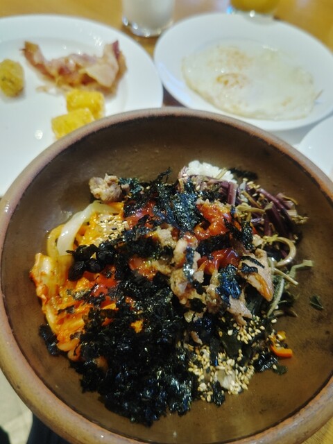 結果はかなりクオリティー高かったかと思います。まず、セルフでビビンパプが作れました。ビビンパプの材料の質が良いです。用意されていたもの以外に自分でプルコギと目玉焼きを加えました。美味しかったです。それ以外でも、オムレツ、ヤンニョムチキン、サラダ等等が美味しかったです。