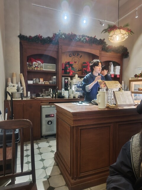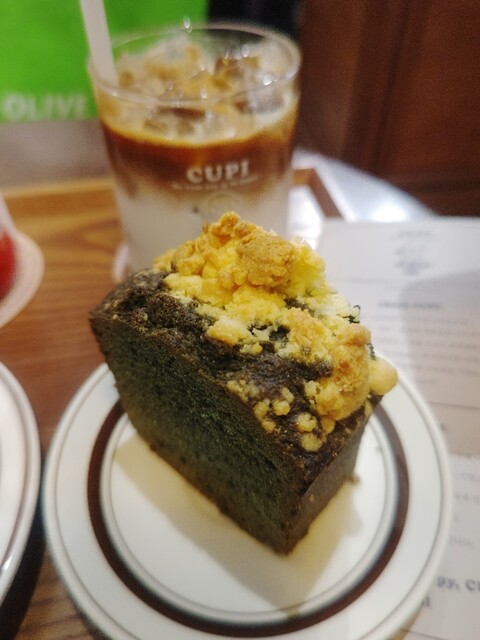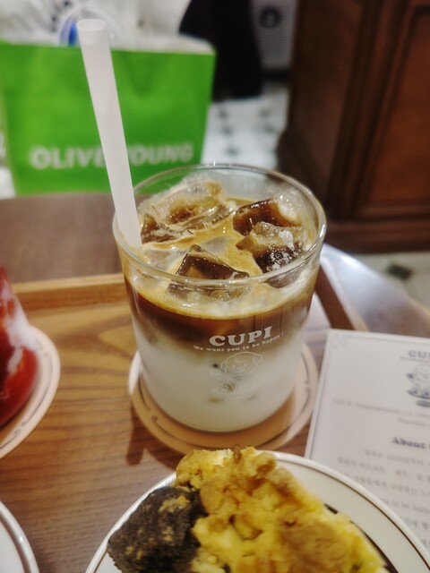 「今日のコーヒー」という名前のコーヒーが美味しかった。いろいろ混ざっているようでしたが、上手く融合されていました。韓国のケーキは生地が硬めでした。味そのものは美味しかったです。