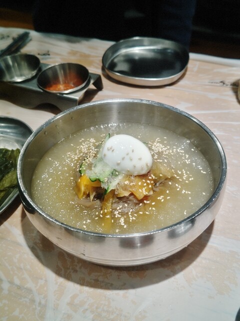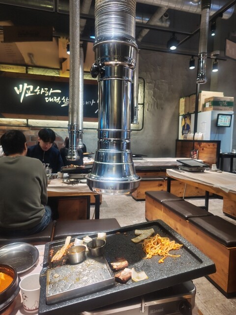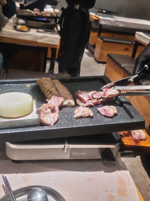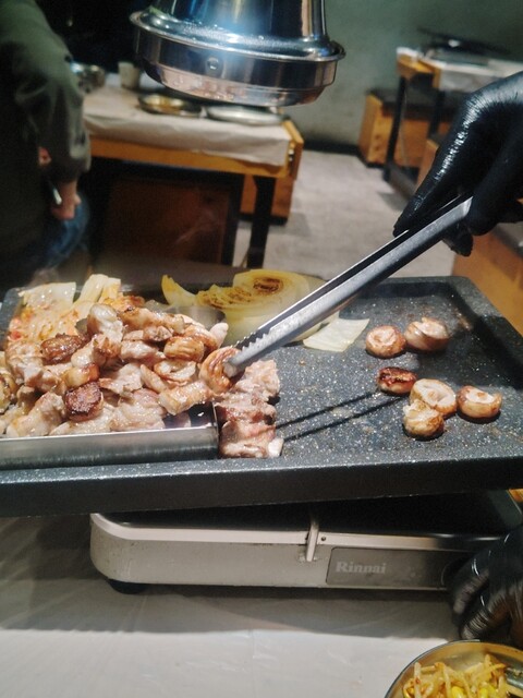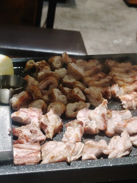 サムギョプサル、デジカルビ、マッチャンを一人前ずつと冷麺、コチュジャンスープを注文。最後に娘の希望でマッチャンを一人前追加。