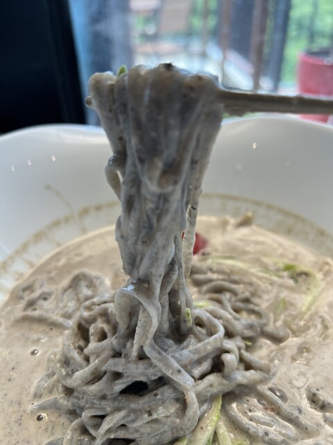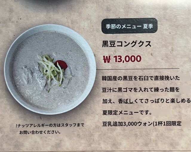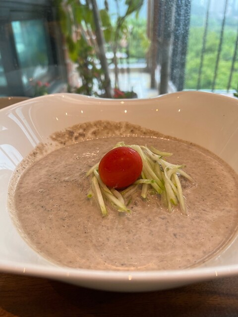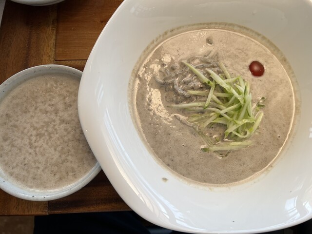 夏限定の黒豆コングクスを注文。一杯につき一度だけ追加注文できるスープもオーダーしました。スープは黒豆を石臼で挽いて作った豆乳で、ざらっとした舌触りが心地よく、冷たく冷やされていてキュウリやトマトのトッ...