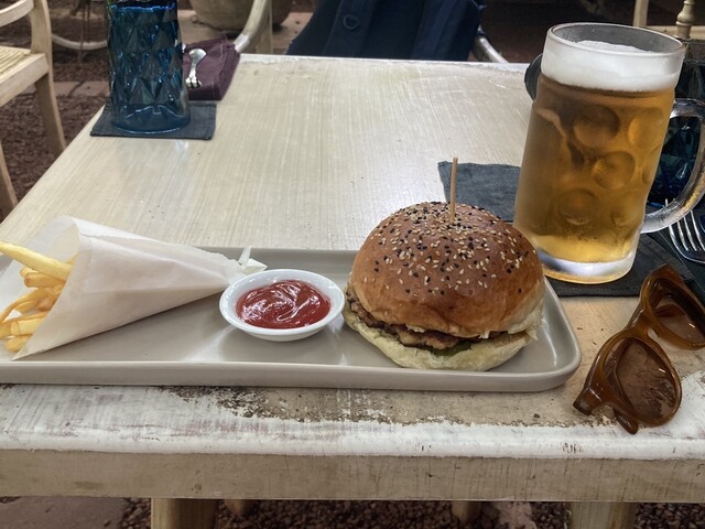 ランチは、「海老パティのハンバーガー」にします。カリッと焼き上げられたパティーが香ばしく、エビの甘さも感じます。また、付け合わせのポテトとともに、ビールによく合います。