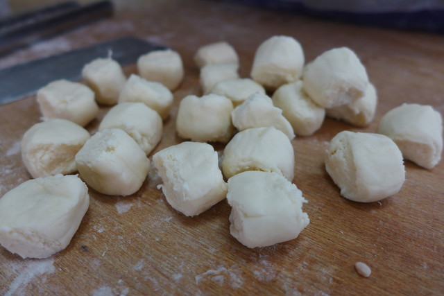 千歳飴のような棒状の生地を小さく刻み、平たく延ばして。