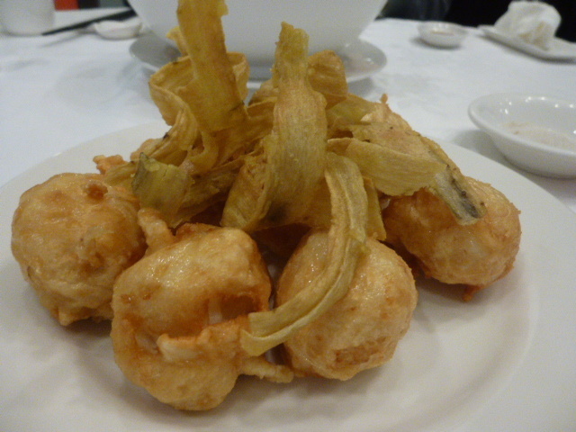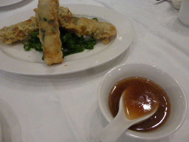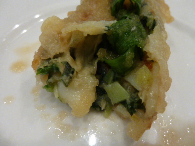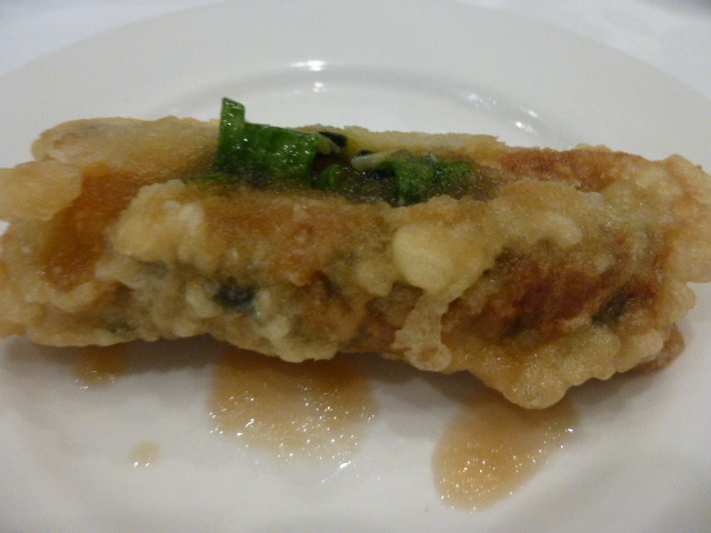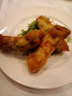 カキやイカを細かく刻んだものと海老のすり身、にらをたっぷり入れたあんを巻いて揚げてる