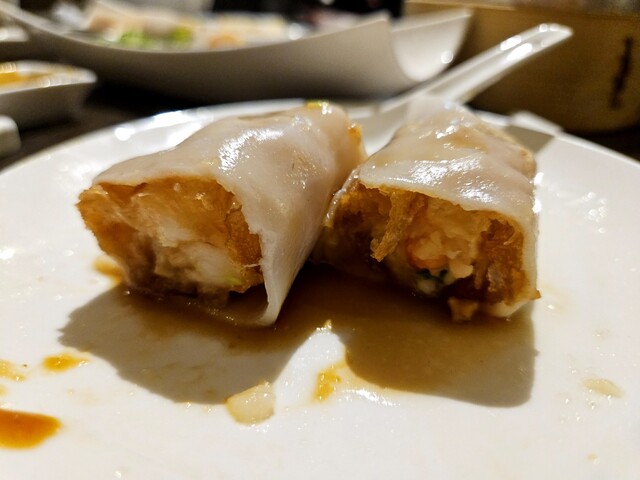 揚げエビ春巻のライスペーパー巻きは、ユニークな料理。もっちりしたライスペーパーの中はカリっとした春巻と、プリプリしたエビなので、一口で三度美味しい食味食感です。