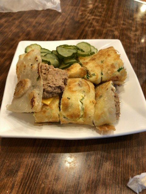 店に着いてアイスティーとトーストのセットとツナの蛋餅を注文。