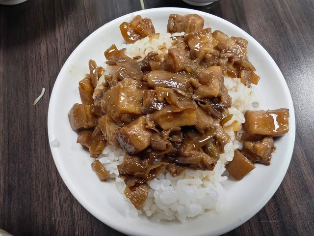ロース肉大盤とササバラ肉毎盤に牛脛肉と果物と野菜を煮込んで作ったベースのキャベツ入りスープ。牛肉肉燥飯とタレ、薬味はセルフ式でお代わり自由だが、以前は作れた〆の雑炊は禁止になっている。