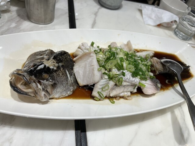 スズキの蒸し物。醤油と生姜のソースがサッパリ
