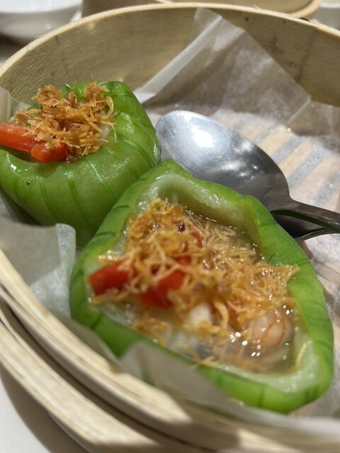 ヘチマの中に海老やホタテのあっさり塩味の餡と。