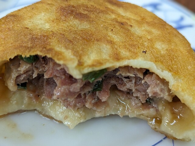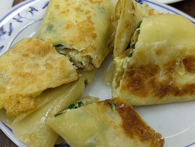 指差し注文したので正確な料理名は不明ですが、恐らく「蛋餅」と言う台湾では定番のオカズ系クレープででしょう。中にはネギやら薄焼き玉子やらが含まれており、塩味のお好み焼きのような味わいです。