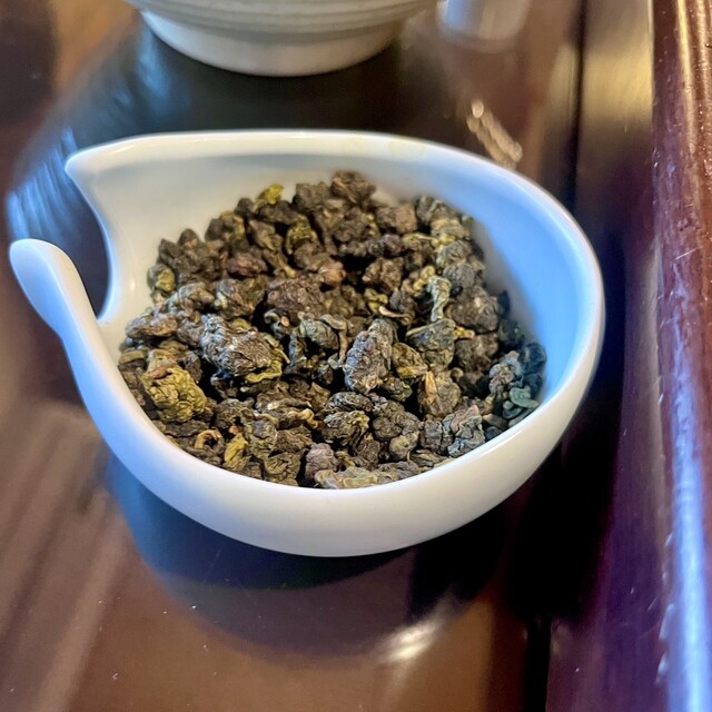 木盆に伝統的な台湾茶器一式(急須・茶海・茶杯・香杯・茶葉入れ)で提供。茶葉は高山烏龍茶でした。さっそくスタッフが笑顔でお茶の淹れ方を実演してくれました。