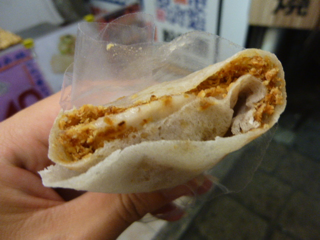 小麦粉の薄焼きクレープの上にピーナッツ粉を敷いてアイスとパクチーを乗せ包んだものらしい