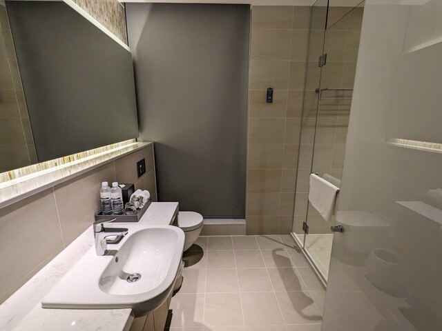 ウェットエリアも広々としています。バスタブはありませんが、普段わたしは温泉以外は浴槽に浸からないので全く無問題。他方、水回り全てが一室に押し込められているので、複数人で泊まった場合は不便かもしれません。