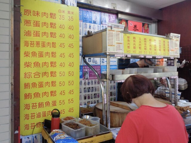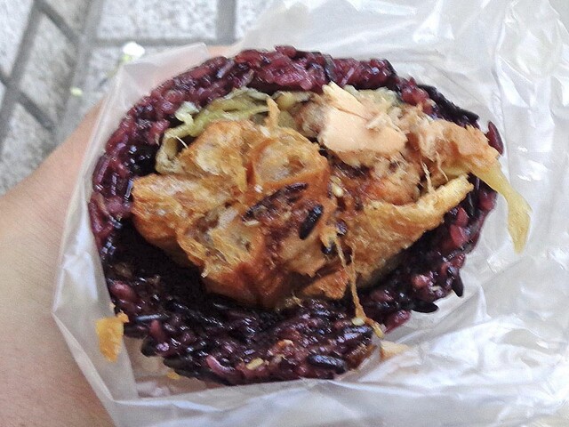 周囲は,温かくツヤツヤの紫米(長粒種;餅米)で覆われています.中身は,油條(揚げパンのようなもの)・肉鬆(甘い肉そぼろ)・ツナ・酸菜(高菜のような漬物)・ダイコンの漬物等で,たっぷり入っていました.