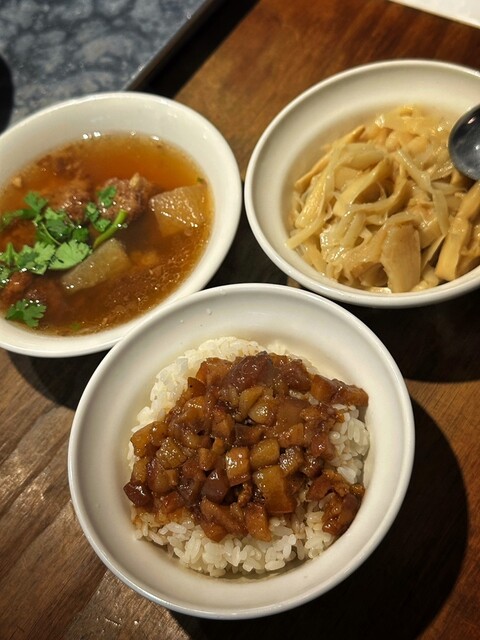 頼んだのは魯肉飯(小)に、豚バラ軟骨のスープ、タケノコの煮物。魯肉飯は甘辛タレと八角の...
