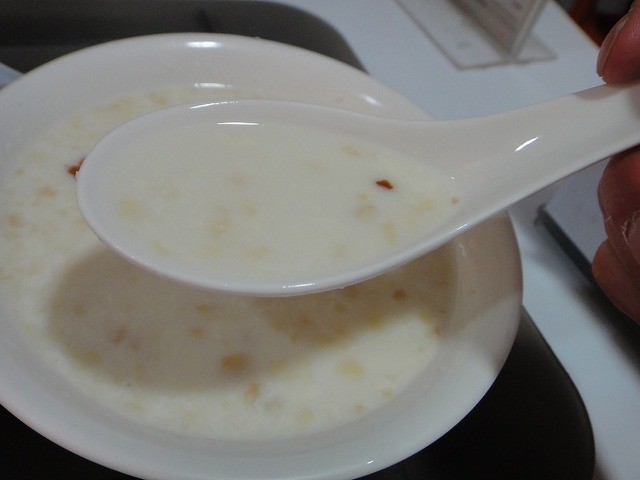 濁ったスープの中に平べったい杏仁豆腐が入っているのですが、