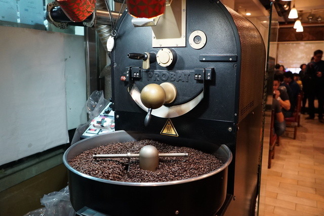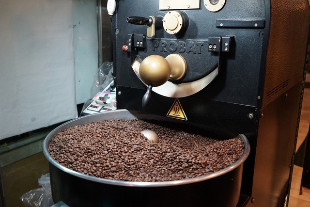 待つこと約10分、入口付近に着席できた。すぐ前にはその時は動いてはいなかったが大きな焙煎器があった。生豆から焙煎もしているようだ。