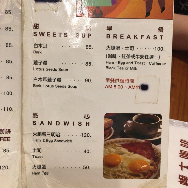 朝ご飯で訪問。セットのモーニングメニューは1種類。ハム入り目玉の潰れた目玉焼き、トースト2枚、ドリンクで10NTD=400円。一般的な台湾朝食としてはやや高めなのかも知れないがコーヒー付きなのでこちらをオーダー。店内は70年代のアメリカンポップスが流れる。月曜の9時過ぎだが客はほぼ満席。地元客だけで無く外国客も多し。待つことしばしでハム入り目玉の潰れた目玉焼き到着。思ったより大きい。玉子二個分か。すべて目玉は潰れている。トースト二枚には苺ジャムがのっておりそれとは別にバターが添えられている。バターをトーストに塗り玉子を挟んで戴く。テーブルの食塩を多目に掛けると結構美味い。コーヒーのミルクは日本製雪印のポーションが2個。何となく懐かしい味になる。10NTDの価値は充分感じる高品質のモーニングであった。