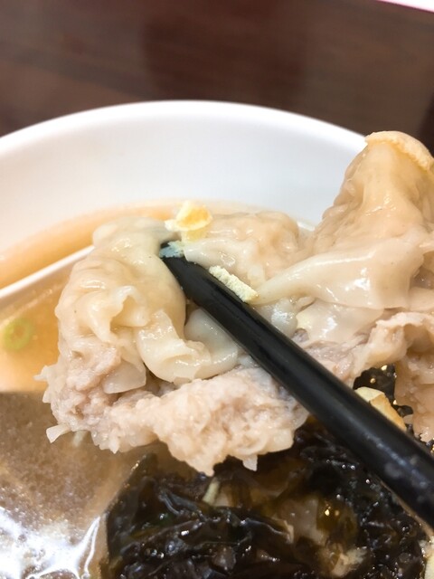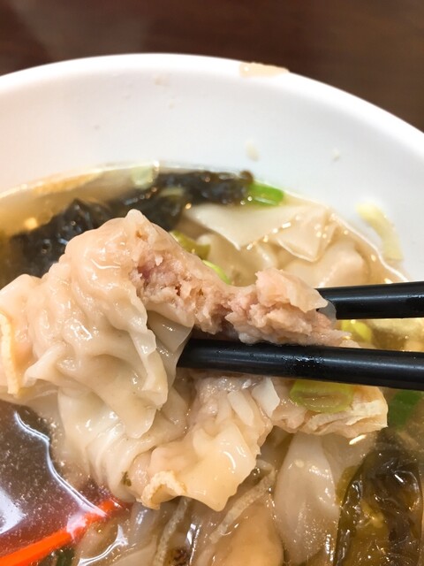 大きなワンタンがたくさん入っていて、海苔らしきものと錦糸卵、ネギが乗っています。スープは透き通っていてアッサリ味。