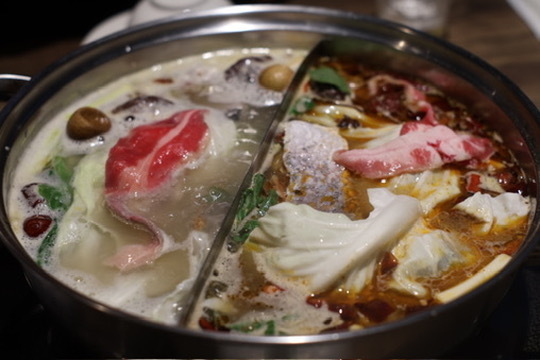 エスニックたっぷりの辛くて赤いスープと薬膳の穏やかな香りがする優しい白いスープの巴鍋です。