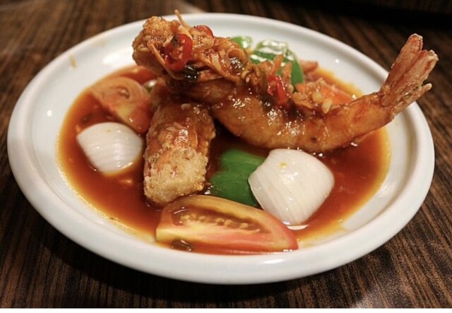澎湖産の大きなエビはプリプリ。サツマイモ粉で揚げているので殻はカリカリで頭からガブリといただけます。中華らしい味を引き出す五味粉を使ったチリソースは酸味と甘みがあり、辛さは控えめ。
