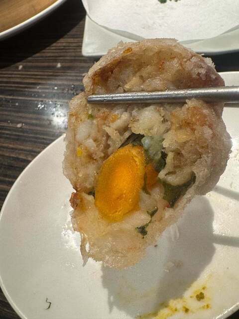 多分台湾料理の卵の黄身とタロイモを揚げた料理がベースになっている料理。タロイモの代わりにを海老を使う事でよりゴージャスにしたもの。この店のオリジナル。