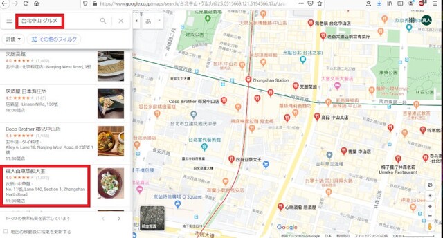 今、家のPCで再現していみます。検索欄には「台北中山グルメ」と入力していますが、現地からだと「グルメ」「ディナー」といったキーワードだけで複数の店をサジェストしてくれます。
