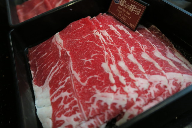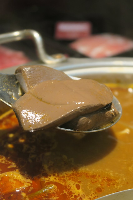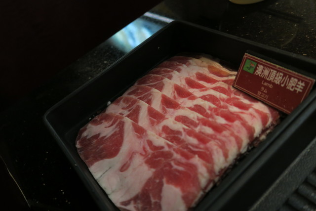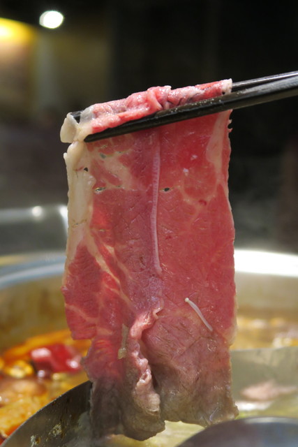 10種類以上の四川薬材からなる2種類のスープが基本だ。基本的には辛い麻辣、辛くない2種類と考えていいだろう。肝心の具材は牛肉、豚肉、羊肉、海鮮、モツ類、野菜など、とにかく種類が多く。何を頼むか考えているだけでもワクワクしてくる。焼肉バイキングと違い、注文するたびにサーバーがテーブルへ運んでくれるので非常に清潔だ。牛肉はUSDプライム、アンガス、オーストラリアビーフなども取り揃えてあるので出所はしっかりしている。一番うまいと思われる牛肉はUSチョイスのリブだ。羊も美味しかった。台湾国産豚肉は非常に硬くこちらはひち皿でギブアップ。
