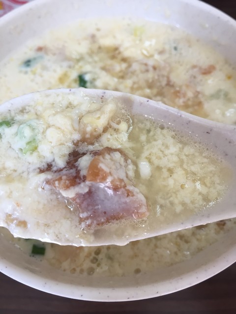 砂糖を加えない、揚げパンやネギがゴロッと入ったタイプ。胡麻油で調味されている温かいスープです。
