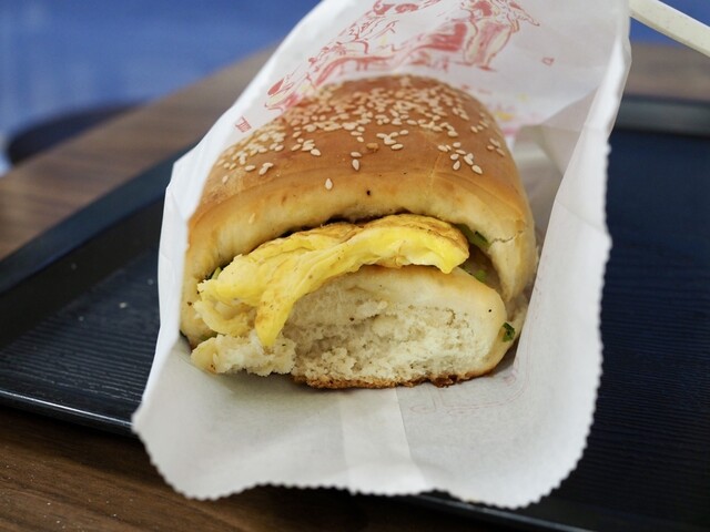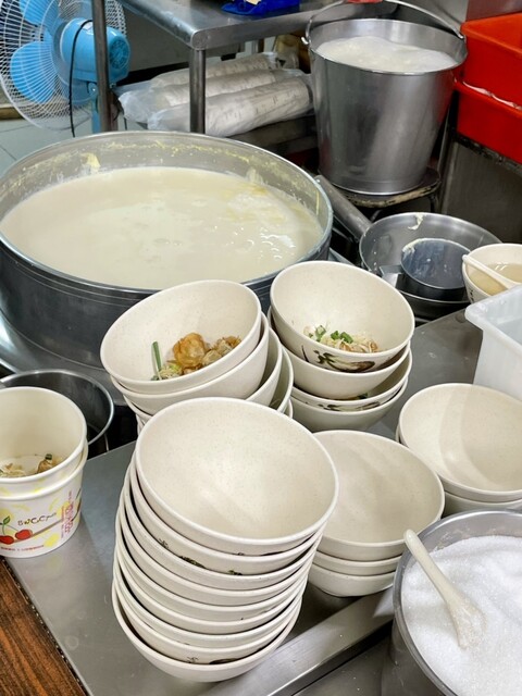 おばちゃんにシェントウジャンと薄焼き卵のパンを頼むと、カウンター横でお椀に豆乳をざっぱと掬いいれてくれますので、それを受け取って席に付きます。