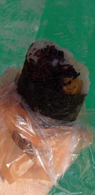 日本のおにぎりみたいに三角ではなく、棒状になっていて、ラップでぐるぐる巻きに。