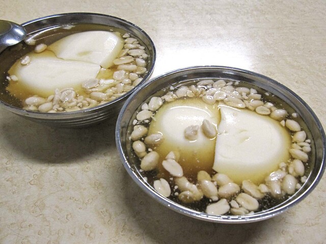 「冰豆花」は,タップリの冷たいシロップに,冷たい豆花と冷たいピーナッツ煮を浮かしたものです.スッキリ・涼し気なビジュアルでした.