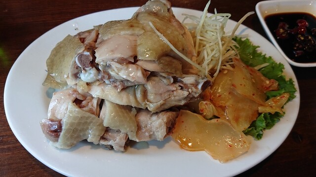 蒸し鶏はホロホロとしてて、箸で簡単にほぐれる。ピリ辛のタレを付けながら頂くとビールにドンピシャ!合う