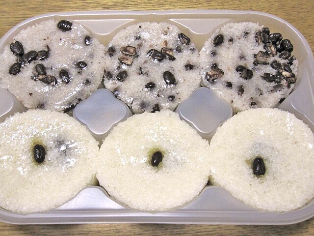 6個のうちの3個は,白色の生地で,小豆がひと粒トッピングされています.もう3個は,薄アズキ色の生地で,たくさんのアズキ粒が混じっていました.いずれにも,こし餡が控え目に入っています.これら2種は,食感・味とも良く似ていました.