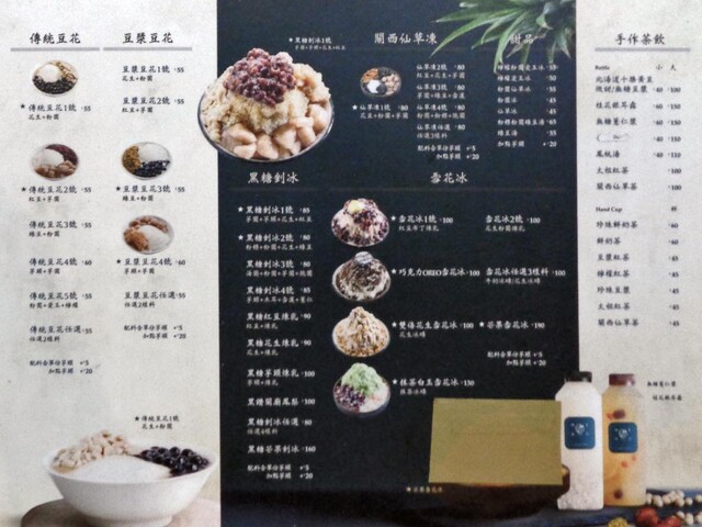 メニューには,豆花類,かき氷類,ソフトドリンク類等があります.