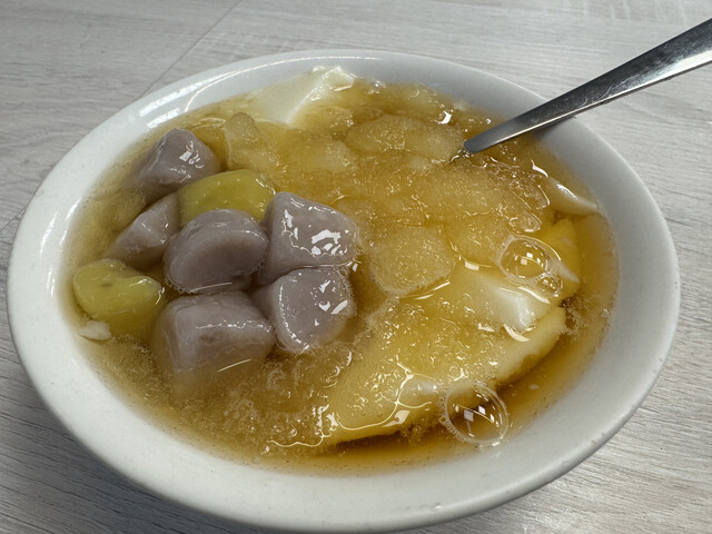 豆花はふるふるでなめらか、甘さ控えめでシロップとのバランスが絶妙。トッピングの芋圓はもちもち、タピオカの食感...