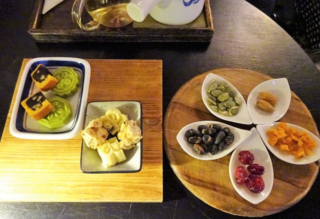 ・落雁2種、ナッツのお菓子、ナッツ入り餡を生地で包んだ月餅のようなもの。