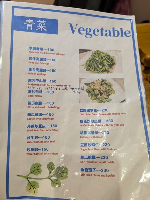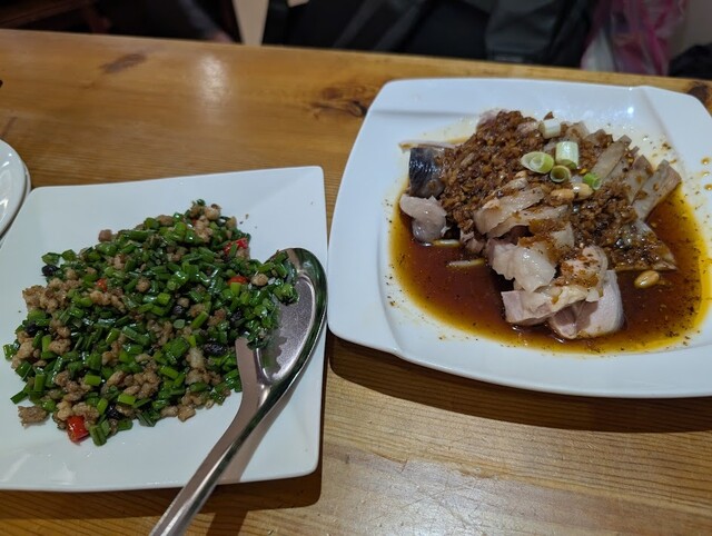 平日の昼に伺いましたが、二階の客席に上がると団体客で埋まっていました。お店の方、入店時に多少戸惑いがあったのはそのせいだったんですね。4人掛けのところに座らせて貰いました。厨房1人だったし、こりゃ時間かかるな、と思いました。案の定、焼きそばや炒飯は断られましたので、てっとり早く、お店のお勧めの3品と空心菜炒めにしましたが、どれもこれも美味しかったです。ホールの女性陣、シェフも皆さん素敵な方々で気持ちよく食事をさせていただきました。