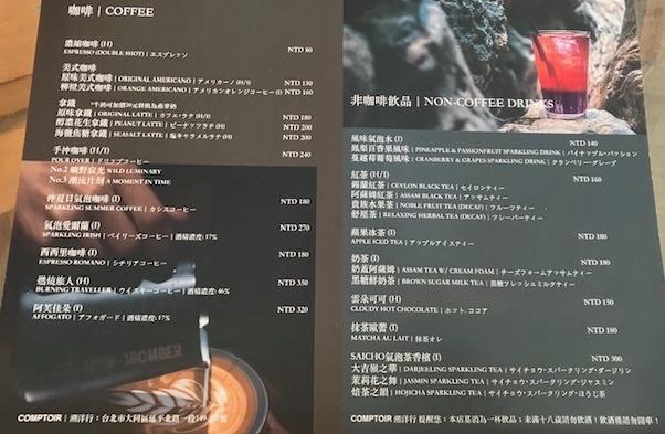 4名で訪問。店内入ってびっくり、東京にもなかなかないような落ち着いたお洒落な空間です。ちょうどカウンター席が空いたところで、片付けて頂いて着席、日本語のメニューからカフェラテTWD180などを注文。