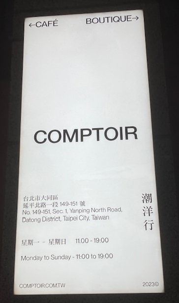 現金支払いをして退店します。後客はありですが満席ではありませんでした。お隣は同じ店名のブティックになっています。https://comptoir.com.tw/