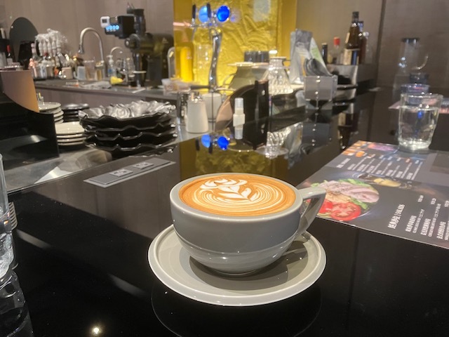 ラテは目の前で作ってくれますが、これまた美しいラテアートです。量もたっぷりで、厚みのある重量感のカップと相まって、実に落ち着いた気分でゆったりと味わえます。