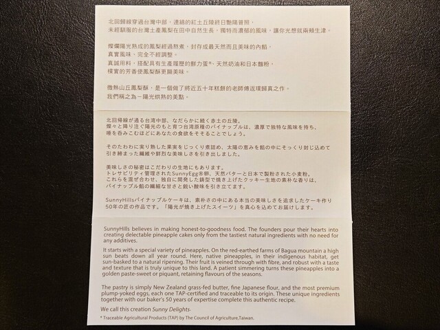 台湾原種の完熟パイナップルをじっくりと煮込んで熟成させたジャムの餡を、台灣産ブランド卵とニュージーランド産グラスフェッドバターを使用したクッキー生地で包んで焼き上げたパイナップルケーキ。