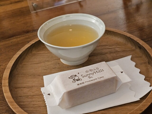 小さなお盆に、お茶とパイナップルケーキがまるごと1つ!!