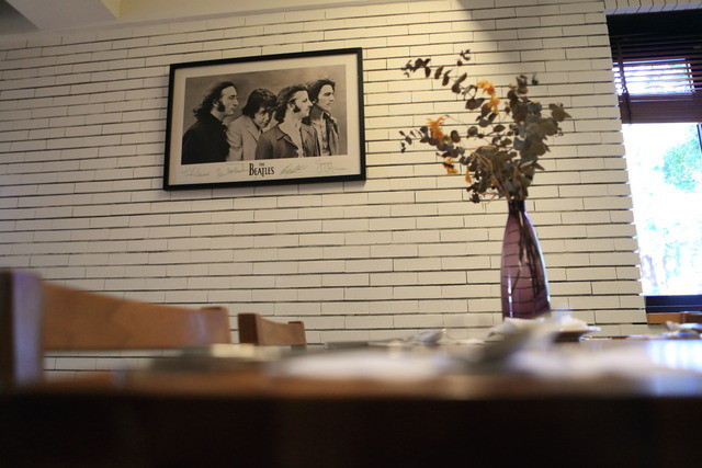 真っ白なレンガ壁には「ザ・ビートルズ The Beatles」のサイン入りポスターが飾られ、