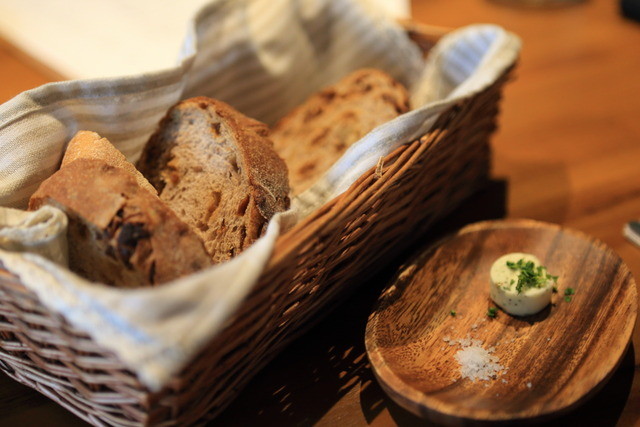 「龍眼や干し葡萄入りの自家製バゲット 地中海ソルト・自家製ハーブバター」80TWD/人