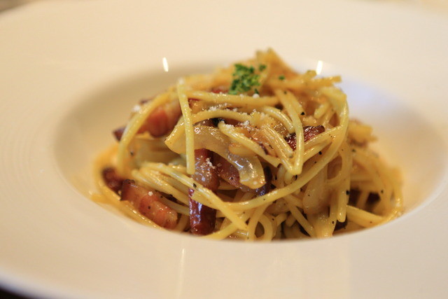 卵黄とパルメザンチーズで仕上げたカルボナーラ。