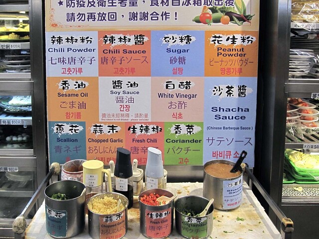 (5)冷蔵ショーケースの脇に,調味料と薬味の並ぶカウンターがあるので,客が好みのものを混ぜてタレを作る(日本語の表示アリ).自分は,沙茶醬(サテソース),辣椒醬(チリソース),ゴマ油,おろしニンニク,青ネギ,トウガラシ,香菜(パクチー)を混ぜました.沙茶醬たっぷりがオススメです.
