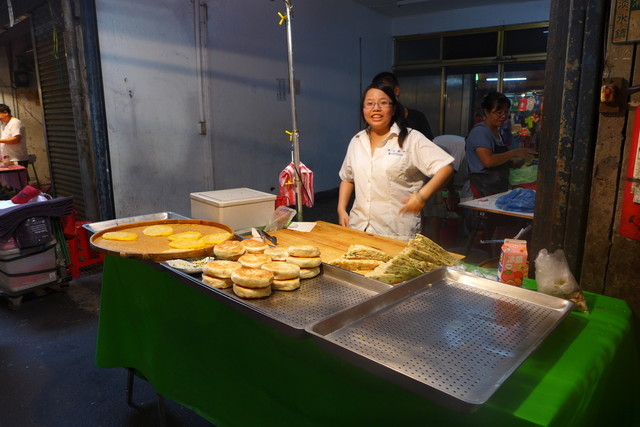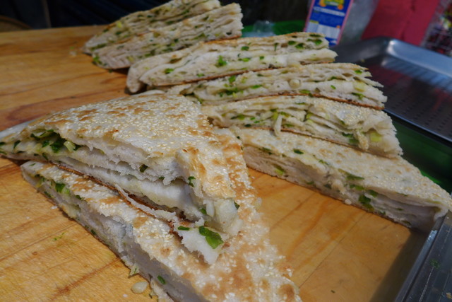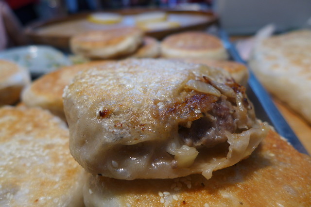 様々な食の出店が軒を連ねる中、空き区画を利用したような、簡易なスペースで焼きたての「大餅」(中華風の大きなパイ...